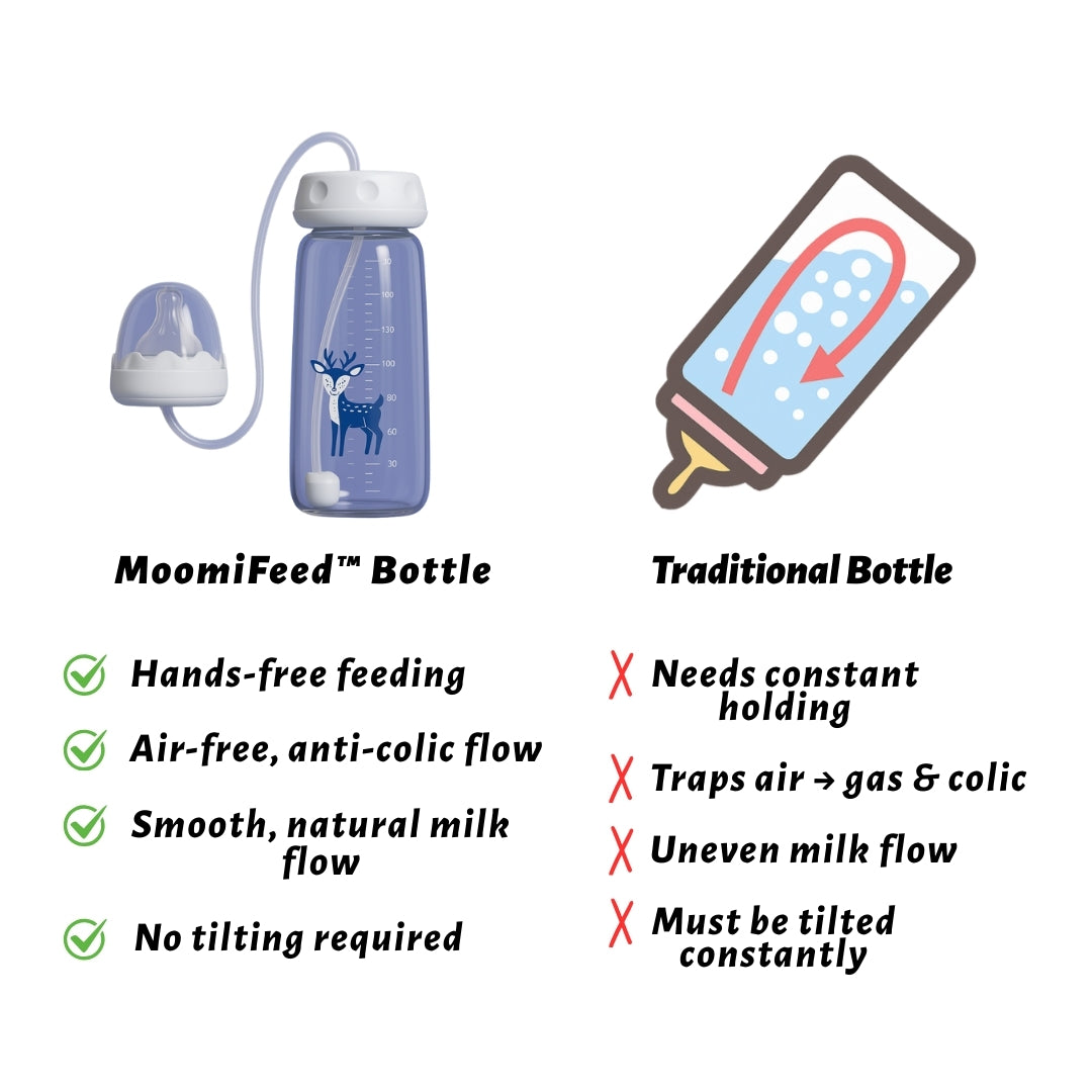 Watch how MoomiFeed™ makes feeding easier, safer, and more comfortable compared to regular bottles. From hands-free convenience to anti-colic air-free flow, you’ll instantly see why parents everywhere are switching.